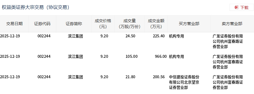 12月19日,滨江集团大宗交易成交151.3万股,成交额1391.96万元,占当日总成交额的4.02%,成交价9.2元,较市场收盘价10.11元折价9%。