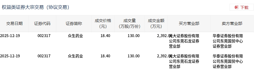 12月19日,众生药业大宗交易成交260万股,成交额4784万元,占当日总成交额的6.41%,成交价18.4元,较市场收盘价19.17元折价4.02%。