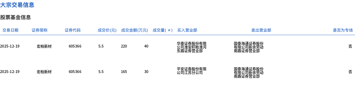 12月19日,宏柏新材大宗交易成交70万股,成交额385万元,占当日总成交额的6.09%,成交价5.5元,较市场收盘价6.1元折价9.84%。