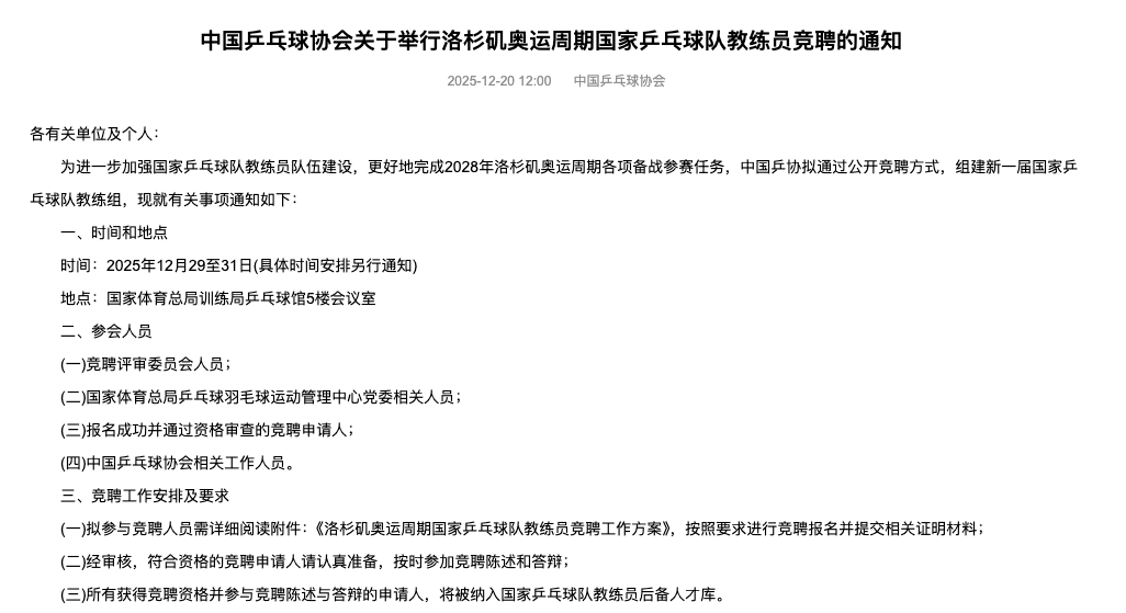 12月20日,中国乒乓球协会网站发布关于举行洛杉矶奥运周期国家乒乓球队教练员竞聘的通知。通知提到,为进一步加强国家乒乓球队教练员队伍建设,更好地完成2028年洛杉矶奥运周期各项备战参赛任务,中国乒协拟通过公开竞聘方式,组建新一届国家乒乓球队教练组。