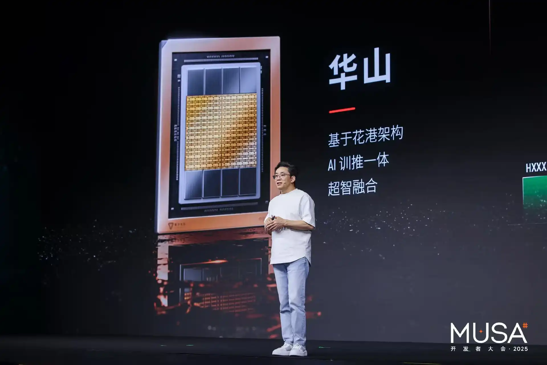 - 1、全功能GPU架构“花港”发布,采用新一代指令集,支持FP4到FP64的全精度计算,算力密度提升50%、效能提升10倍,并发布基于该架构的推出高性能AI训推一体“华山”芯片、专攻高性能图形渲染的“庐山”芯片。