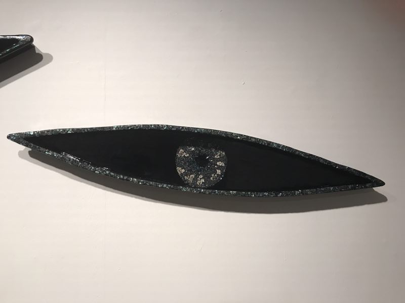 在作品《瞳》中,南希潮利用高丽和朝鲜时代尤为出名的漆艺进行创作。漆是由漆树脂反复提炼后得到的,有一定的毒性。要得到漆,需对漆树进行加热,在特定环境下烘干提炼。这种漆被涂抹在两个独木舟型的制品上,之后南希潮将贝壳和蛋壳的碎片放置于独木舟的中间,做成眼睛的形状,来代表萨满能够觉醒、连通天人的功能。