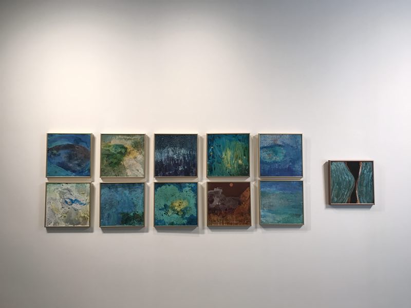在作品《绿魂》(Green Spirit 2016-2017)中,南希潮利用金属铜的氧化现象,制作出十一幅形态、色彩、纹理和层次各异的画作。一方面,画中的青色、绿色、黄褐色代表着自然界中丰富的色彩,另一方面,这些经由金属和空气发生化学反应得到的色彩,也反映了自然在平面上留下的痕迹,铜绿在这里成为有灵之物,它的运动轨迹和外部形态,都构成了其生命的一部分。