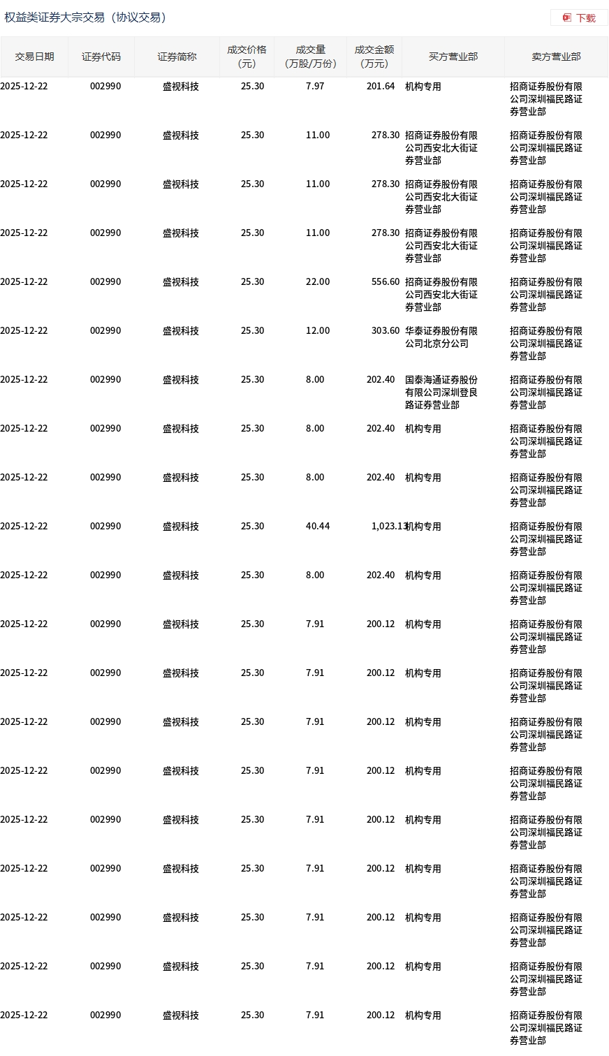 12月22日,盛视科技大宗交易成交372.93万股,成交额9435.09万元,占当日总成交额的29.8%,成交价25.3元,较市场收盘价28.35元折价10.76%。