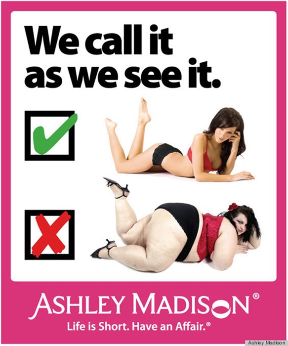 北美婚外情社交网站Ashley Madison曾经在报纸上刊登了一则宣传。画面上一个姿态相当诱惑的胖姑娘穿着性感内衣,而文案则是“你老婆昨天晚上吓到你了吗?春宵苦短,来段婚外恋吧”。这鲜明的对比不但让婚后发福的女性害怕,也在教育潜在男性用户——与面对家里年老色衰的唠叨妻子,还不如用Ashley Madison找点乐子。