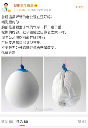 在中国这样的例子也数不胜数。这则微博整形广告用两个气球代表了女性的外形——一个圆润饱满,一个则干瘪充满皱纹,暗指产后女性下垂的胸部和皱巴巴的腹部。他们用两只气球教育消费者,产后的身形是没有魅力的。
