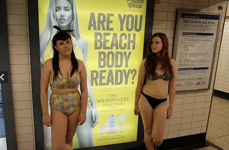 维密的完美身形模特广告越来越不受欢迎。另一个健康食品Protein World的广告则因为用所谓的“沙滩身材”呼吁女性减肥,也遭到超过4万多名英国消费者联名抵制。身形不如广告中完美的女孩们身着泳衣站在地铁灯牌前,抗议广告对于女性身体耻辱的倾向性,最后被英国广告标准协会(ASA)勒令下架。