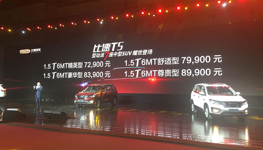 很多消费者才刚刚知晓北汽幻速这个品牌的时候,从摩托车行业起家的重庆银翔去年11月份正式发布了比速汽车并在推出了T3和M3之后,于重庆车展开幕的前夜,又推出了今年的首款新车--T5。这是一款定位7座的中型SUV,也是家族里的第三款产品。T5搭载全系1.5T+6MT的动力组合,分为“精英型”、“舒适型”、“豪华型”、“尊贵型”共4款配置,售价区间为7.29-8.99万元。此外,比速在昨晚发布会上宣布购买T5的前两万名车主还将获得终身免费质保以及5555元的包牌金融方案。