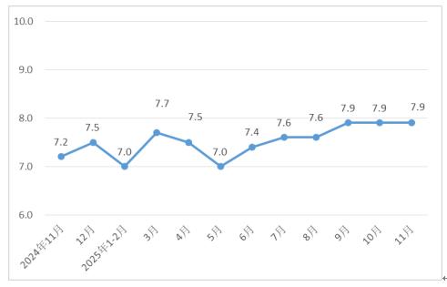 1-11月份,河北省规模以上工业增加值同比增长7.9%。
