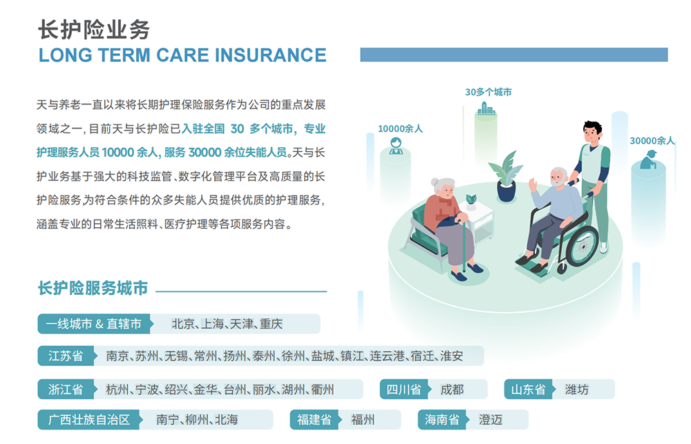 目前天与长护险已入驻全国 30 多个城市,专业护理服务人员 10000 余人,服务 30000 余位失能人员。天与长护业务基于强大的科技监管、数字化管理平台及高质量的长护险服务为符合条件的众多失能人员提供优质的护理服务涵盖专业的日常生活照料、医疗护理等各项服务内容。