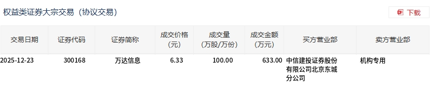 12月23日,万达信息大宗交易成交100万股,成交额633万元,占当日总成交额的5.98%,成交价6.33元,较市场收盘价6.36元折价0.47%。