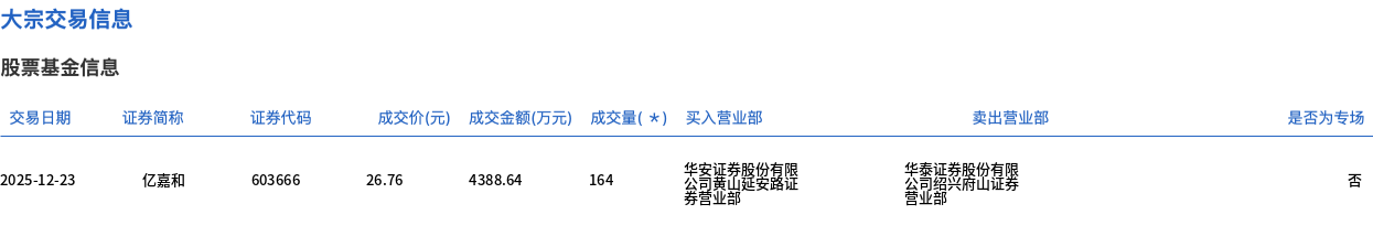 12月23日,亿嘉和大宗交易成交164万股,成交额4388.64万元,占当日总成交额的39.5%,成交价26.76元,较市场收盘价29.47元折价9.2%。