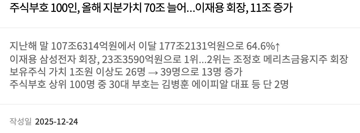 李在镕持有的股票市值同期从12.033万亿韩元增至23.359万亿韩元,增幅高达94.1%。金融服务集团Meritz Financial董事长赵正镐位居榜单第二,手持股票市值10.7131万亿韩元,增加5474亿韩元(5.4%)。排名第三至第五的分别为李在镕母亲、Leeum美术馆荣誉馆长洪罗喜,新罗酒店社长李富真,三星物产社长李叙显。生物科技企业Alteogen代表朴淳宰、娱乐公司HYBE董事会主席房时赫首次进入榜单前十。