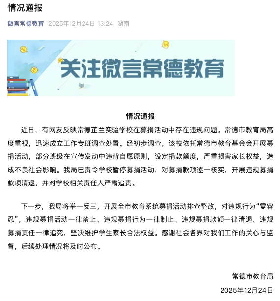 近日,有多位网友在社交平台发布视频曝料,称湖南省常德市芷兰实验学校要求家长向学校教育基金会捐款,每人不少于1000元,引发关注。常德市教育局12月24日发布情况通报:近日,有网友反映常德芷兰实验学校在募捐活动中存在违规问题。常德市教育局高度重视,迅速成立工作专班调查处置。经初步调查,该校依托常德市教育基金会开展募捐活动,部分班级在宣传发动中违背自愿原则,设定捐款额度,严重损害家长权益,造成不良社会影响。我局已责令学校暂停募捐活动,对募捐款项逐一核实,开展违规募捐款项清退,并对学校相关责任人严肃追责。