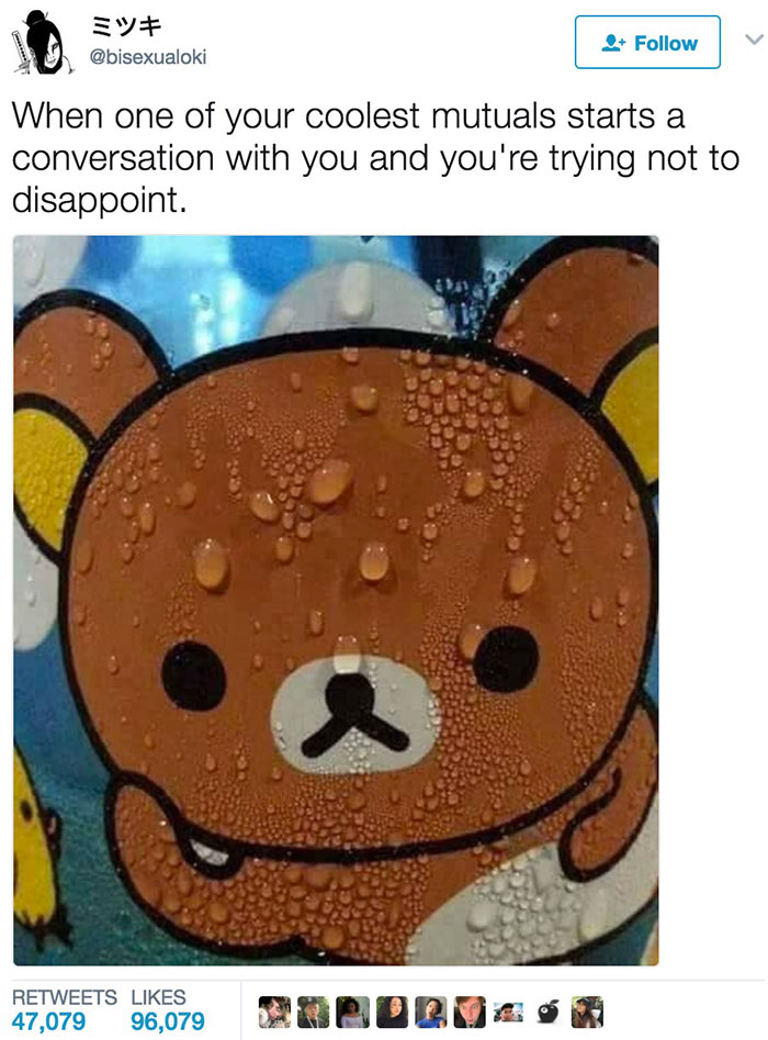 “当你最酷的友邻前来跟你说话,而你努力不让他感到失望的时候。”