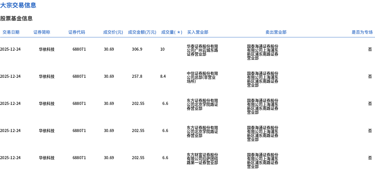 12月24日,华依科技大宗交易成交38.2万股,成交额1172.35万元,占当日总成交额的13.93%,成交价30.69元,较市场收盘价33.33元折价7.92%。