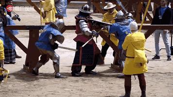 一把关刀举起,试图做点什么,但很快被两把欧式重剑挡开。几十公斤铁板的碰撞声混杂着亚裔女性的尖叫。人们聚在围栏外,离被围攻的中国人不到一米。在这个距离,能闻到铁锈和汗味儿。
