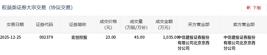 12月25日,宏创控股大宗交易成交45万股,成交额1035万元,占当日总成交额的4.46%,成交价23元,较市场收盘价22.68元溢价1.41%。