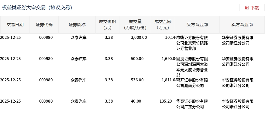 12月25日,众泰汽车大宗交易成交4076万股,成交额1.38亿元,占当日总成交额的28.9%,成交价3.38元,较市场收盘价3.76元折价10.11%。