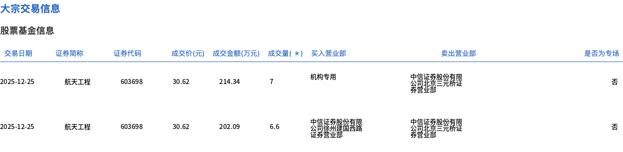 航天工程今日大宗交易折价成交13.6万股,成交额416.43万元