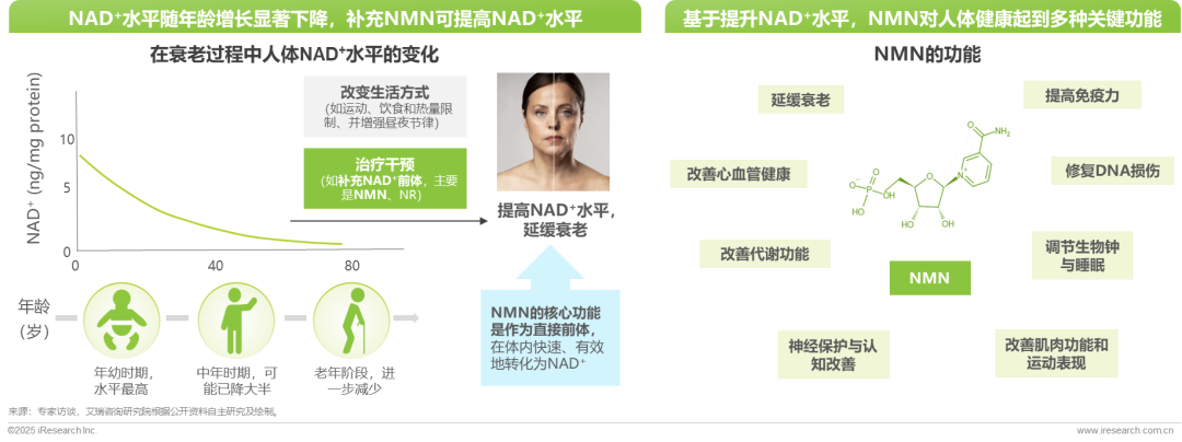 中国社会老龄化进程显著提速。根据中国人口与发展研究中心预测,在2025-2030年期间,60岁及以上老年人口规模将从3.2亿人增长至3.9亿人,老龄化率将从22.8%增至27.7%。规模庞大的“60后”老年人群驱动“银发经济”蓬勃发展,为抗衰老市场提供了潜力巨大的基本盘。同时,“抗衰老焦虑线”正大幅前置。以“90后”为主的年轻群体更早觉醒“抗衰老”意识。60后引领的“银发经济”和90后驱动的“抗初老”形成双重动力,共同推动抗衰老产品市场需求释放,为NMN行业发展提供广阔的成长空间。