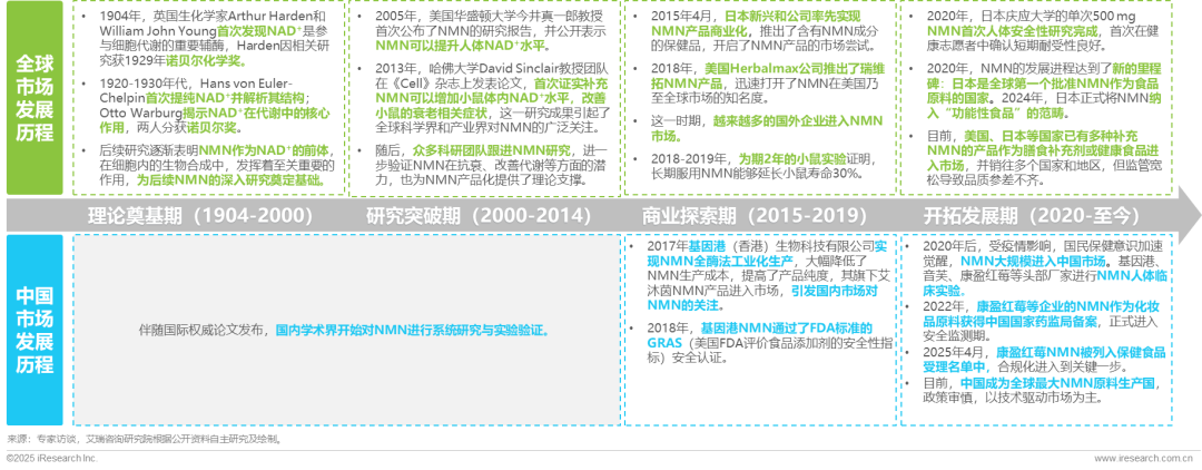 NMN的发展历程始于1904年NAD+的首次发现,相关科学基础在20世纪逐步奠定。进入到21世纪,NMN的研究进入了关键转折点:2013年哈佛大学David Sinclair教授团队在《Cell》发表里程碑研究,证实NMN可延长小鼠寿命30%,引发全球资本关注,为NMN的产品化提供了理论支撑。2016年开始,日本、美国率先启动NMN的商业化进程,中国香港的基因港公司也同步研究全酶法工艺推动NMN的工业化生产,驱动大众消费市场形成。2020年以后,国内外相关机构和企业持续推进临床人体实验以丰富科学数据。日本、美国等国家积极推进NMN的食品化政策但产品监管待完善;中国成最大的原料生产国,NMN行业目前进入合规化的关键一步。