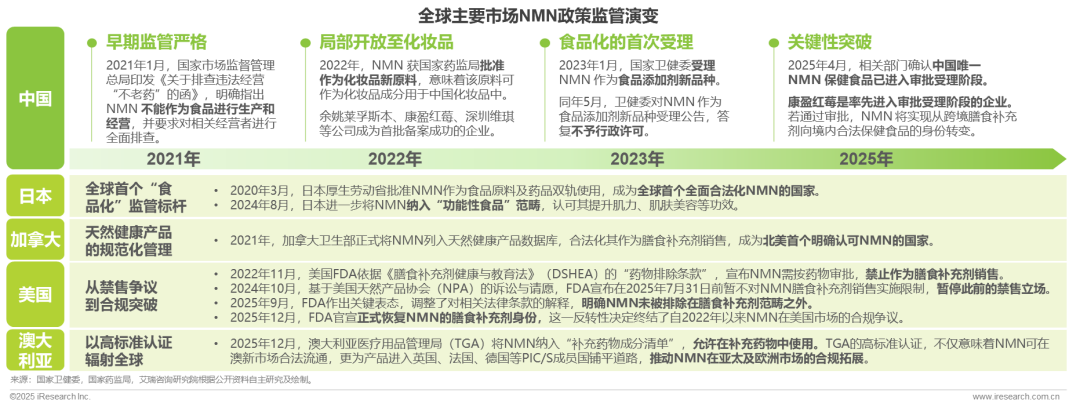 2025年,NMN全球合规化进程迈入实质性加速阶段。随着12月美国与澳大利亚相继明确为其背书,美国、日本、加拿大、澳大利亚等全球主要市场均已通过不同监管路径确认NMN的合法地位。这标志着国际监管共识已从早期的安全评估阶段,转向如何在清晰的安全边界内推动其规范应用的新阶段。