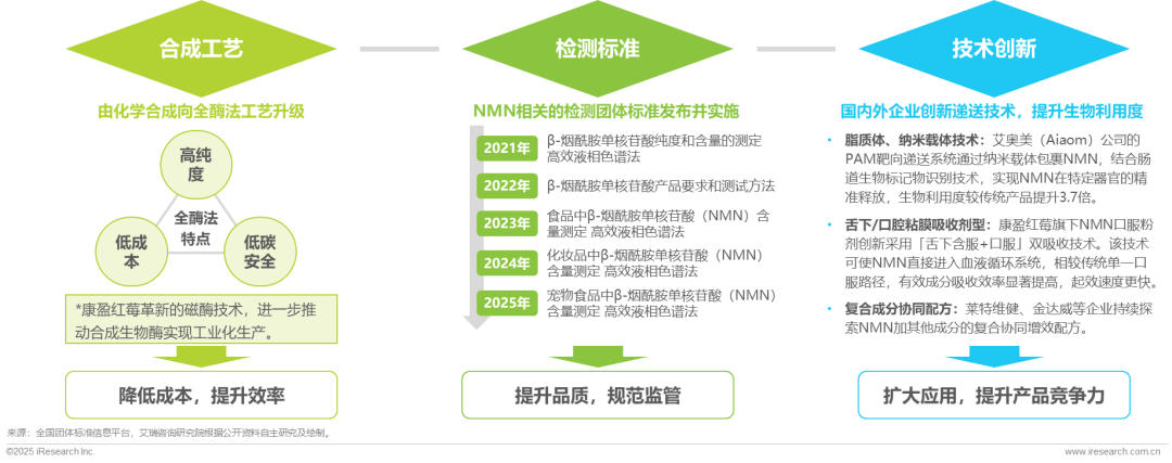 技术突破构成NMN行业跃升的重要驱动力。合成工艺的持续革新,特别是全酶法的高效应用,大幅提升了产能并显著降低了生产成本。与此同时,检测标准的逐步建立与完善,显著提高了行业技术准入门槛,驱动市场规范化发展。在产品端,针对口服吸收瓶颈的递送技术创新(如纳米载体、舌下吸收和复方协同)显著提升了NMN的生物利用度和用户体验,为产品实际功效提供了坚实保障。合成、检测、递送三大技术维度的协同突破,共同驱动行业向规模化、规范化、高效化方向迈进。