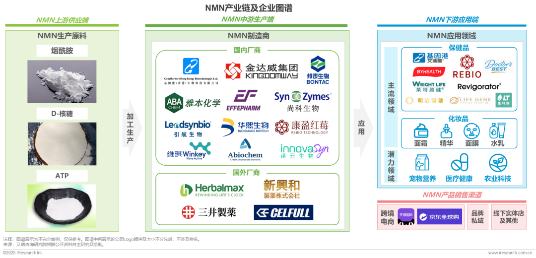NMN主流应用领域包括保健品和化妆品,未来有望进一步渗透到宠物营养、医疗健康和农业科技等潜力场景