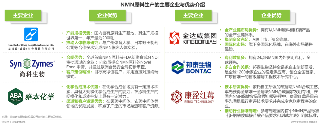 中国NMN原料企业依托全酶法和发酵法工艺实现技术突破,凭借价格和可规模化生产优势,推动产业链布局,构建全球核心竞争力。中游生产端的主要厂商各有侧重,加速技术转化与市场拓展,共同推动NMN产业发展。基因港具备产能规模优势,持续投入推动人体临床实验;尚科生物走在合规前列、精准定位客户群体实现盈利;雅本化学借化学合成技术与渠道资源整合发力;金达威集团资金充足,实现全产业链和国际化布局;邦泰生物专注技术专利,深化多方合作关系;康盈红莓凭借独家技术研发优势,推动NMN行业标准制定及国内保健食品合法进程。