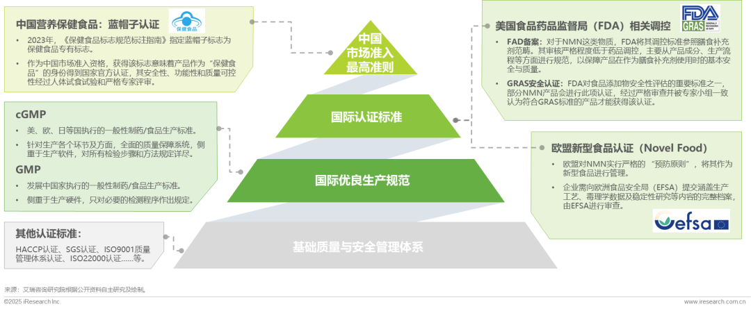 在全球NMN行业认证金字塔中,中国药监局批准的 “蓝帽子” 认证,以极其严格的审评标准和漫长的审批周期,高居行业认证金字塔顶端,代表着产品安全性与合规性的最高权威背书。受限于这一严苛门槛,此前国内多数企业转而通过国外审批路径完成产品申报。若未来NMN产品获得“蓝帽子”资质,行业市场格局有望被彻底重塑。
