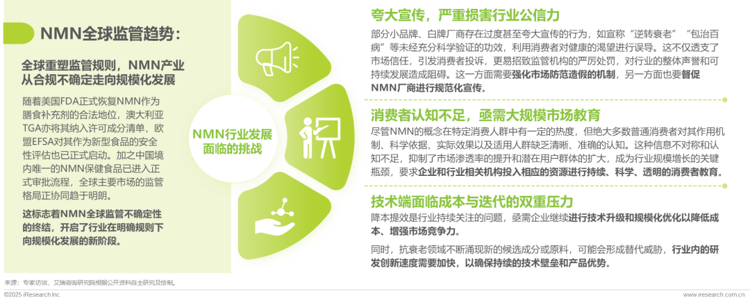总体而言,全球重塑NMN监管规则,行业前景广阔,但亦面临夸大宣传、认知缺失与技术迭代等多重挑战。企业需要以“合规为盾,技术为矛”,积极推动合规化进程,同时以技术迭代构建长期竞争力,释放更大的市场空间。