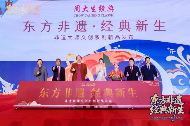 大会现场,启动仪式星光璀璨。周大生副董事长、副总裁周飞鸣,周大生董事、专职业务副总经理郭晋,周大生永久荣誉董事向钢,周大生永久荣誉董事卞凌,携手特邀嘉宾清华大学黄维教授登台,与周大生经典品牌大使李小冉,及杨文琴大师共同亮相。众人执起鎏金瓶,将璀璨金沙缓缓倾入启动台,标志着周大生经典非遗大师文创系列新品的正式发布。