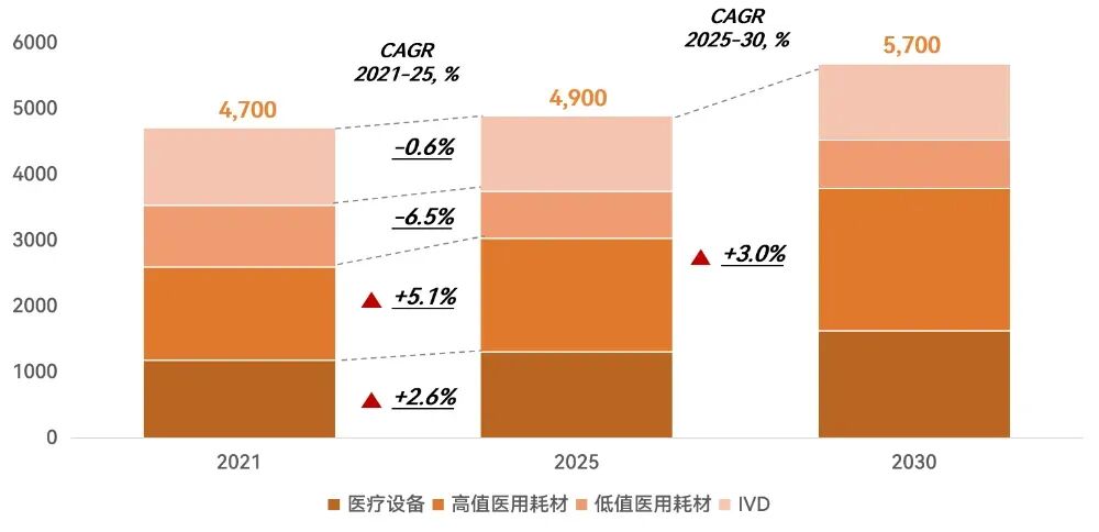 2021年以来,中国医疗器械行业在经历疫情与集采等因素带来的增长波动后,逐步进入结构性调整阶段。2025年,尽管部分领域与企业面临阶段性挑战,产业整体仍展现出强劲韧性,市场规模保持增长。尽管增速放缓,中国仍是全球第二大单一国家医疗器械市场。未来五年,我们预计整体行业将保持个位数复合增速,到2030年,国内医疗器械整体市场规模将达到5700亿元。