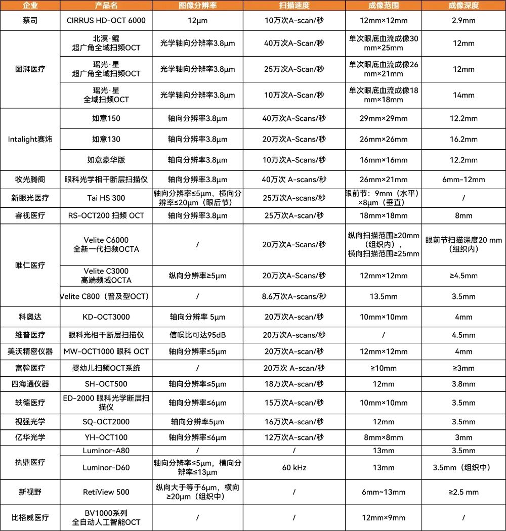 旺盛的临床需求催生了产品的密集上市。截至2025年12月,累计已有34款眼科OCT设备获得NMPA批准,其中国产品牌以25款的数量占据主导地位,仅2025年就有8款国产新品获批,远超往年水平。观察国产产品的参数表现,头部国产品牌在扫描速度、成像深度及分辨率等核心指标上也已实现对进口品牌的赶超,具备了扎实的产品竞争力。
