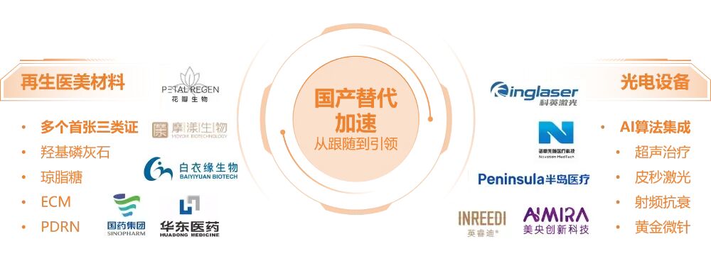 首先,国产替代正从“替代”走向“引领”,头部企业凭借产品与许可数量构建起显著优势。在注射填充领域,国产替代路径已完整呈现:从胶原蛋白产品打破进口垄断,到2025年以羟基磷灰石、琼脂糖为代表的新材料率先获得Ⅲ类证,国产品牌已从追赶者变为平行竞争者。以华熙生物为例,截至2025年5月,其已拥有13项三类医疗器械批文,其中11项为医美注射类产品,这一数量在行业中处于领先地位。在光电设备领域,国产突破更具标志性。以皮秒激光设备为例,科英激光自主研发生产的国产皮秒激光治疗机,成功实现了该领域设备的国产化与进口替代。同时,被誉为“抗衰金标准”的射频设备及多款国产皮秒激光设备相继上市,表明国产设备在中高端市场与国际品牌的技术差距正在快速缩小。
