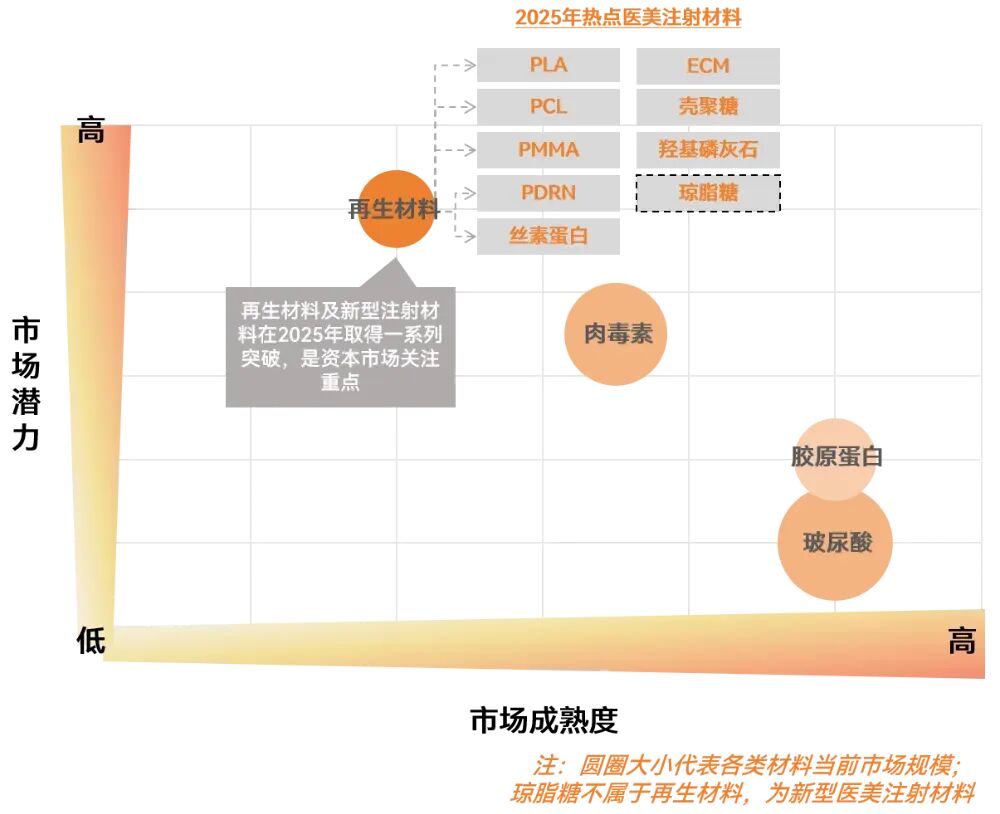 其次,以再生材料为代表的新材料创新呈现“井喷”之势,并受到资本市场的高度关注。2025年,行业热点已超越传统的玻尿酸和肉毒素,向多元化生物材料扩展。羟基磷灰石和琼脂糖均在这一年获得了首张Ⅲ类证,实现了合规化应用的从零到一。与此同时,ECM(细胞外基质)、PDRN等创新成分汇聚了大量企业研发资源。资本市场也迅速跟进,例如,专注于ECM材料的美柏生物在2025年4月完成了由可孚医疗领投的数千万元A++轮融资。这些材料不仅用于注射填充,其应用也向功能护肤、创面修复等相邻领域延伸,推动了“医美与护肤融合”的产业趋势。