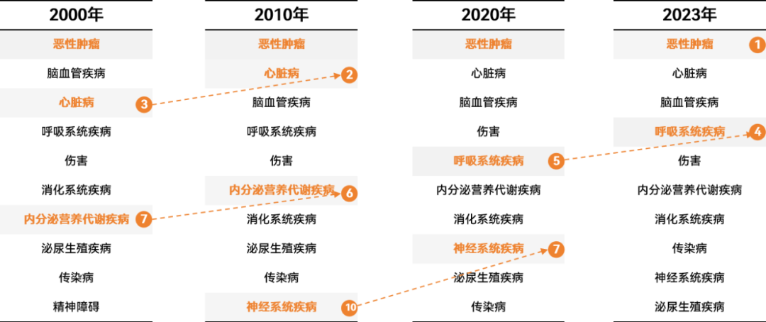 2000-2023年中国十大死因顺位变化