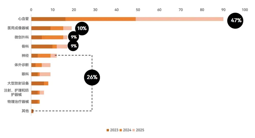 一级市场温和回暖,投资偏好“高科技”赛道。尽管当前投融资环境整体趋于审慎,具备明确临床价值与技术壁垒的医疗器械赛道仍展现出较强的资本吸引力。2025年融资数据显示,医疗健康机器人、心血管介入、医美、眼科及影像设备位列融资事件数量前五位,反映出资本向高门槛领域集中的趋势。在亿元级融资中,医疗机器人、脑机接口、眼科与医美等高价值赛道同样表现突出,进一步印证了这一结构性偏好。