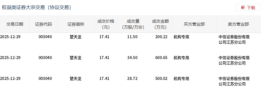 12月29日,楚天龙大宗交易成交74.72万股,成交额1300.89万元,占当日总成交额的1.34%,成交价17.41元,较市场收盘价20.15元折价13.6%。