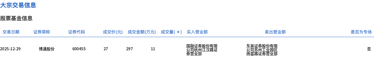 12月29日,博通股份大宗交易成交11万股,成交额297万元,占当日总成交额的9.63%,成交价27元,较市场收盘价25.79元溢价4.69%。