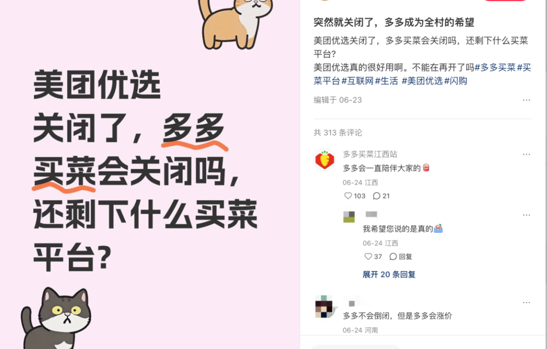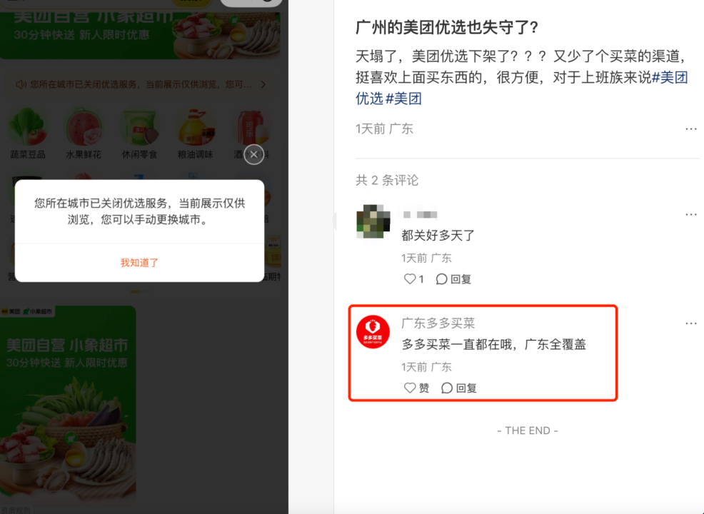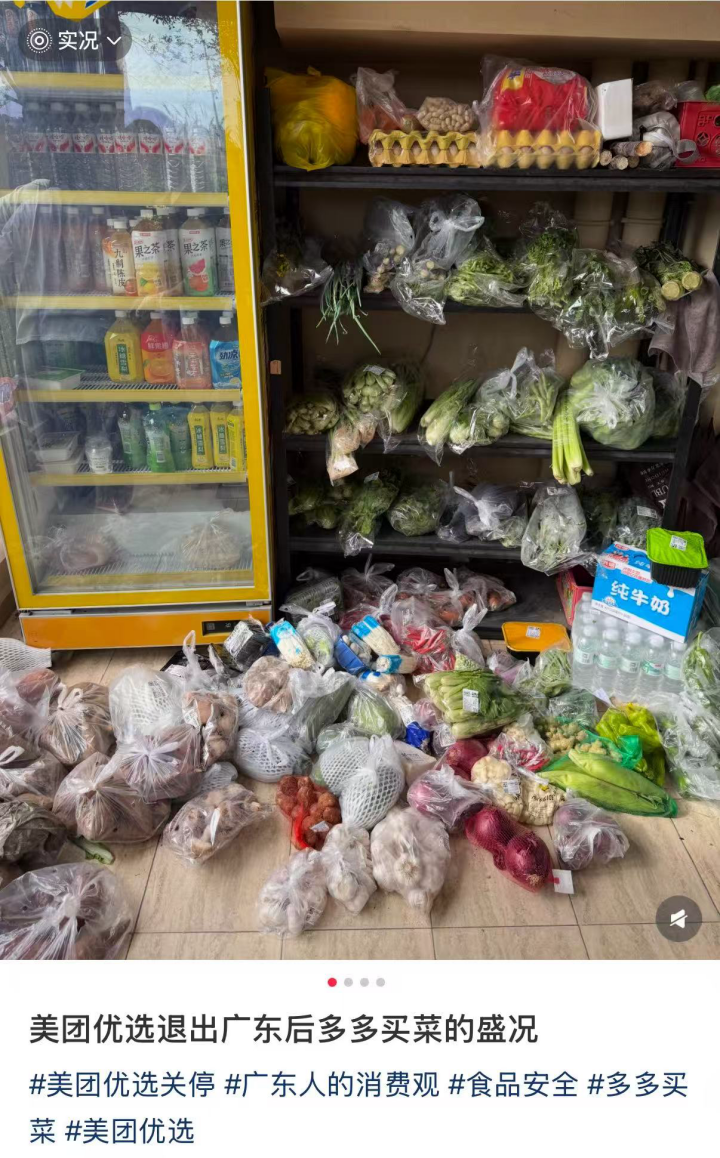 同时,经美团优选关停过的区域,总会迎来一片消费者的哀叹,以及多多买菜的爆单。