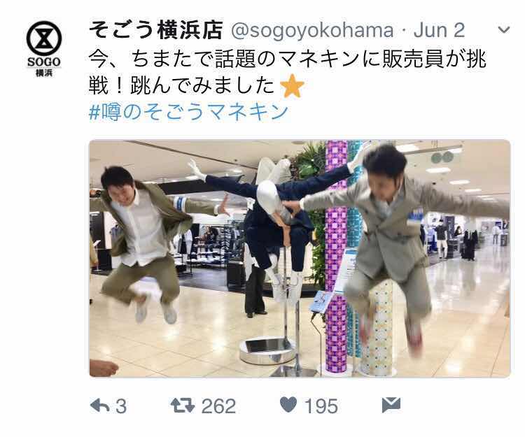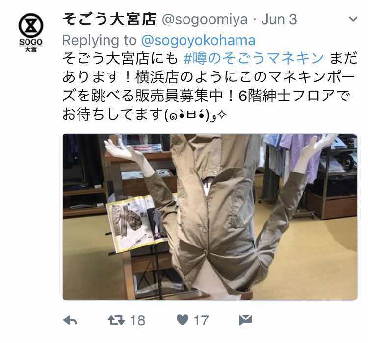 这还不够,Sogo百货大宫店自己上传了一张模特的后空翻造型,来作为招聘广告。它说,人形模特并不只是横滨Sogo百货有,大宫店也有家人模特,并且在招募可以摆这个pose的店员,如果你要应征的话也可以到六楼的男士商品部投简历。随后横滨店的twitter账号也转发了这条内容。