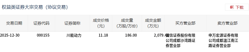 12月30日,川能动力大宗交易成交186万股,成交额2079.48万元,占当日总成交额的5.05%,成交价11.18元,较市场收盘价11.76元折价4.93%。