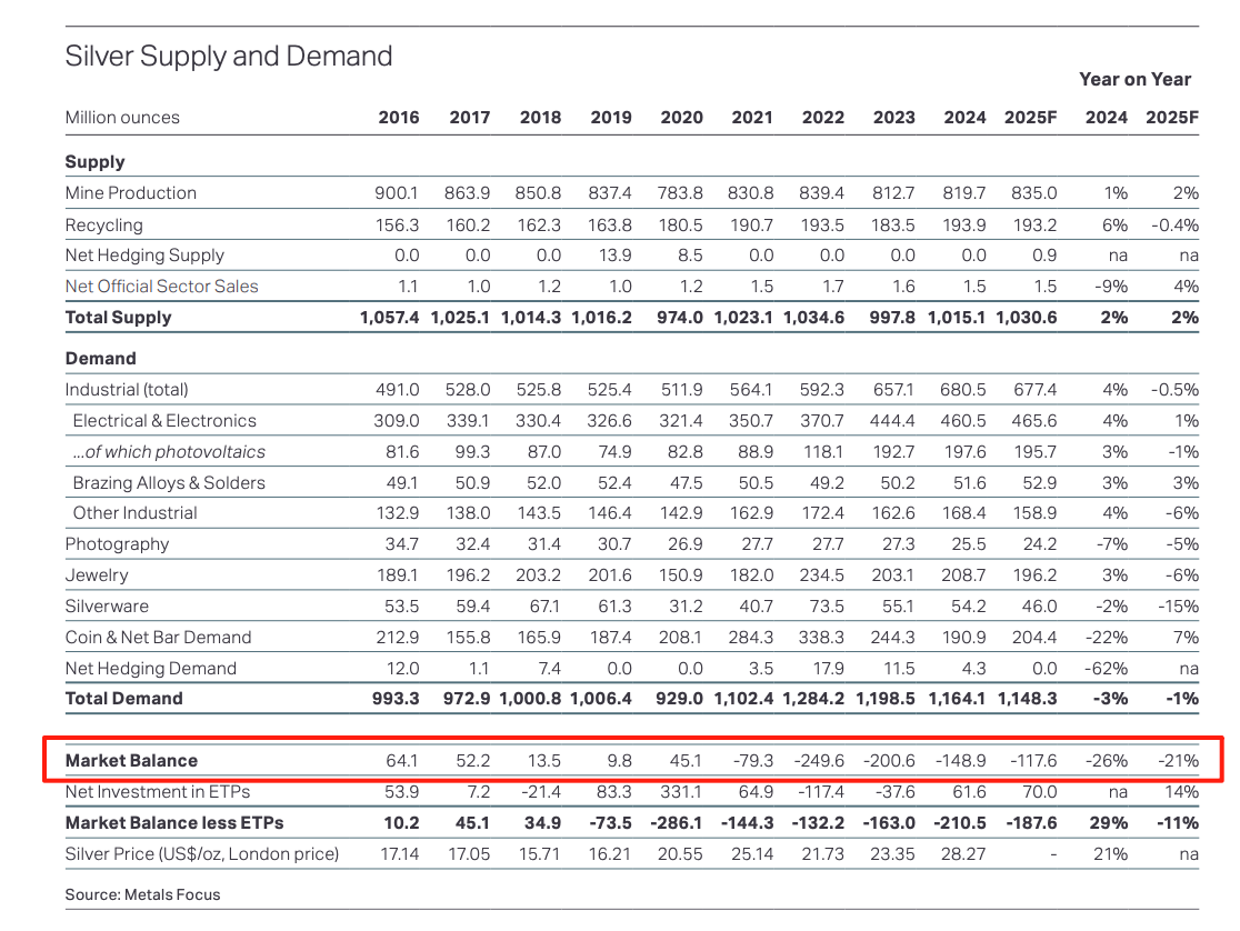 值得指出的是,近年来白银长期处于供需失衡的状态。根据白银协会发布的《2025年世界白银调查》,2025年全球白银缺口预计为1.176亿盎司,较2024年有所收窄。数据显示,从2021年至今,全球白银一直呈现出供不应求的状态。