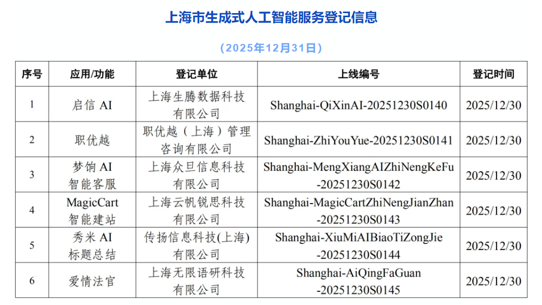 12月31日,据“网信上海”消息,截至12月31日,上海市新增6款已完成登记的生成式人工智能服务,累计已完成145款生成式人工智能服务登记。