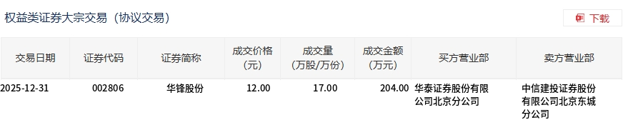 12月31日,华锋股份大宗交易成交17万股,成交额204万元,占当日总成交额的2.17%,成交价12元,较市场收盘价12.46元折价3.69%。