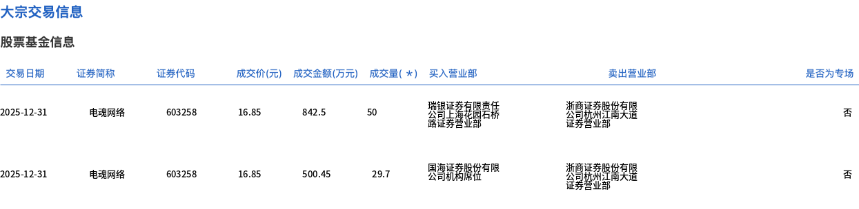 12月31日,电魂网络大宗交易成交79.7万股,成交额1342.95万元,占当日总成交额的26.15%,成交价16.85元,较市场收盘价18.51元折价8.97%。