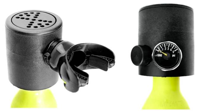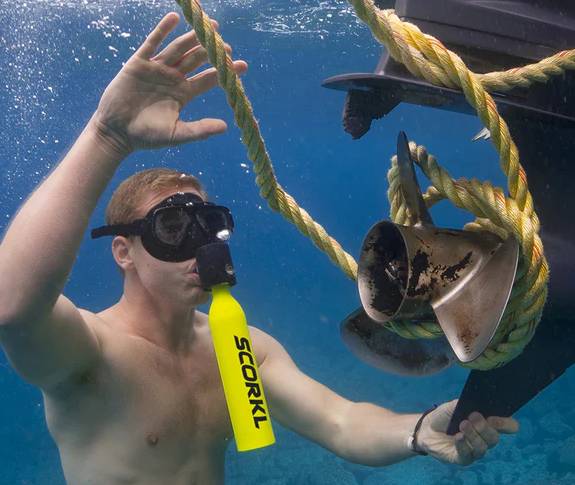 Scorkl 大小跟矿泉水瓶差不多,每次充满一罐氧气,可以在让你在水下游泳 10 分钟。