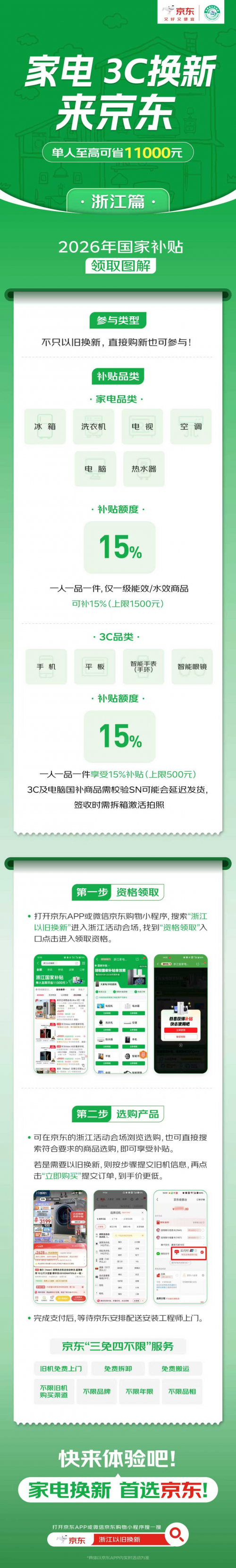 1月1日,2026年国家以旧换新补贴落地浙江,京东线上线下全面承接国家补贴落地,助力政策高效触达消费者。浙江消费者打开京东APP,搜索“浙江以旧换新”,即可直达国家补贴专区,轻松选购心仪好物、畅享补贴优惠。消费者购买活动指定的冰箱、洗衣机、电视、空调、电脑、热水器产品,单件/单次至高补贴1500元;购买活动指定的手机、平板、智能手表手环、智能眼镜产品,单件/单次至高补贴500元。单人累计至高可省11000元!此外,京东也带来海量爆款好物,1月1日起,上京东领国补,买手机、电脑、家电等好物低至五折!